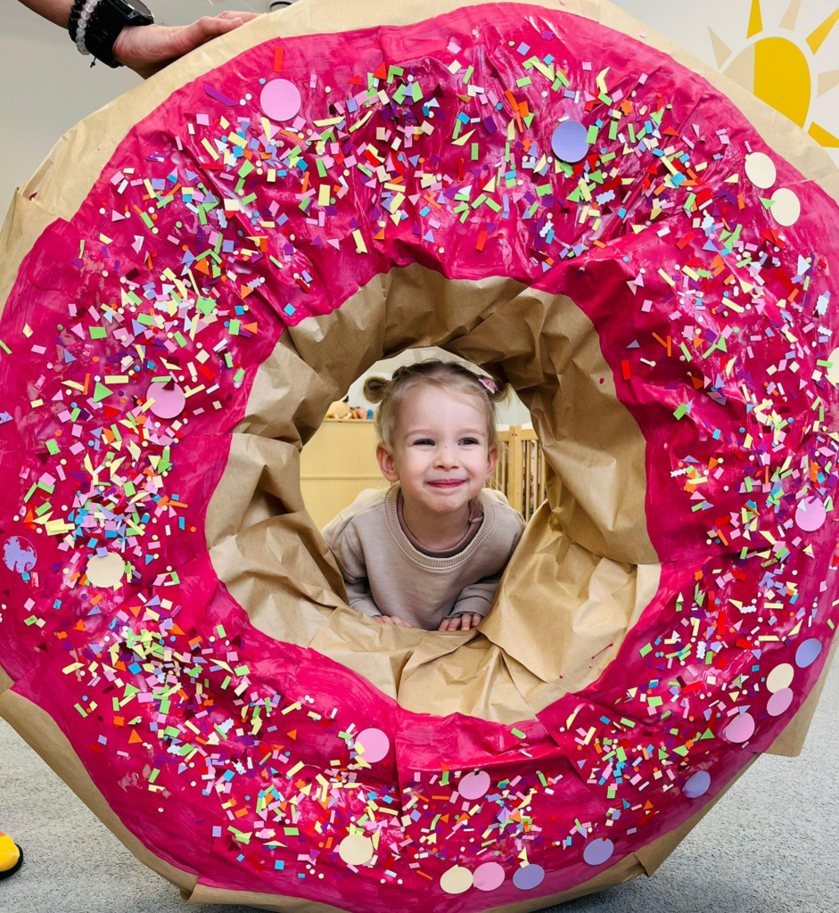 Dziewczynka pozuje do zdjęcia w makiecie donut’a , w różowej polewie i posypce.