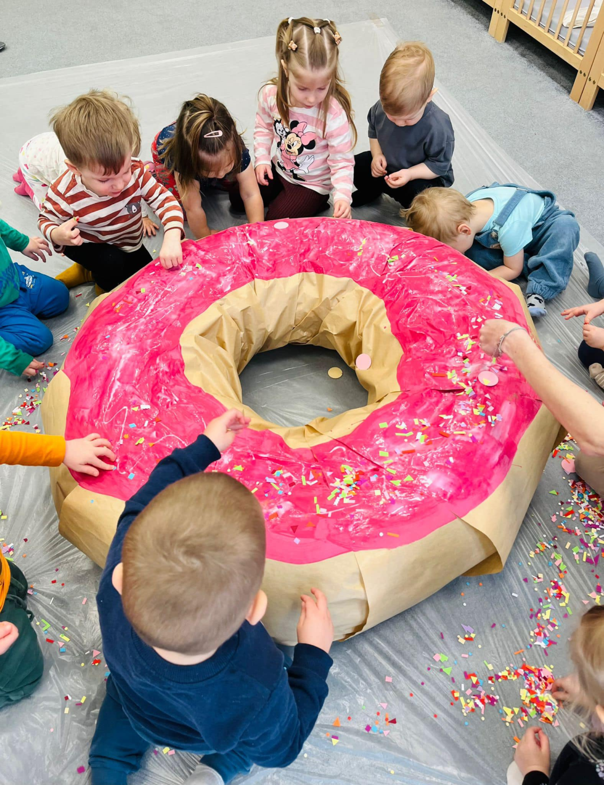 Dzieci posypują kolorową posypką makietę donut’a.