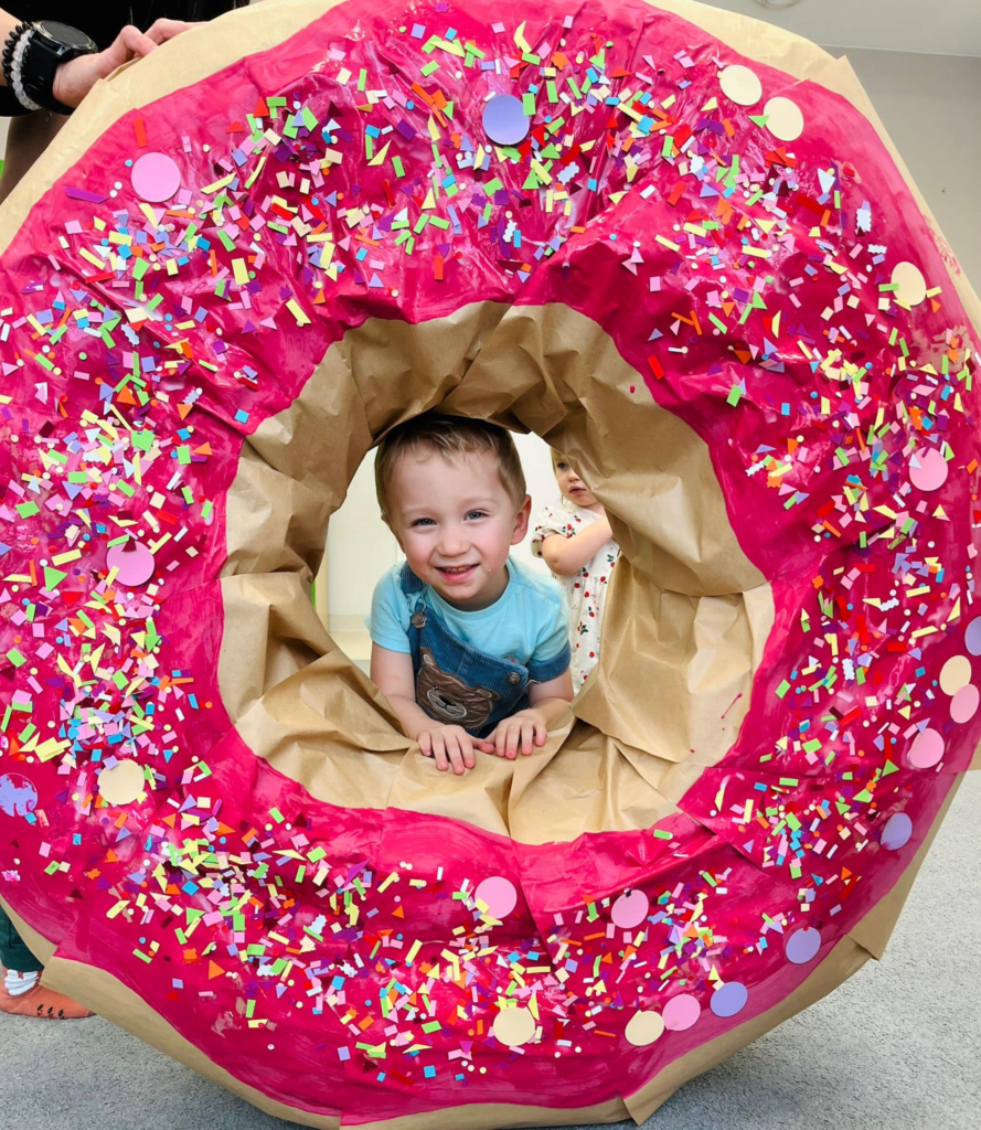 Uśmiechnięty chłopiec w makiecie donut’a pozuje do zdjęcia.